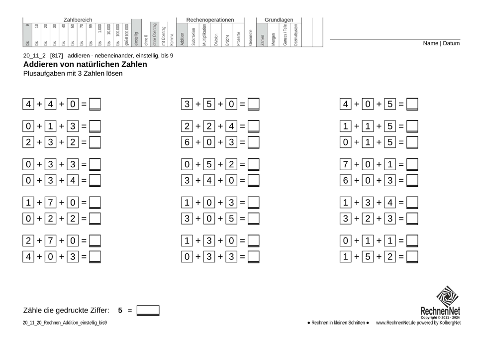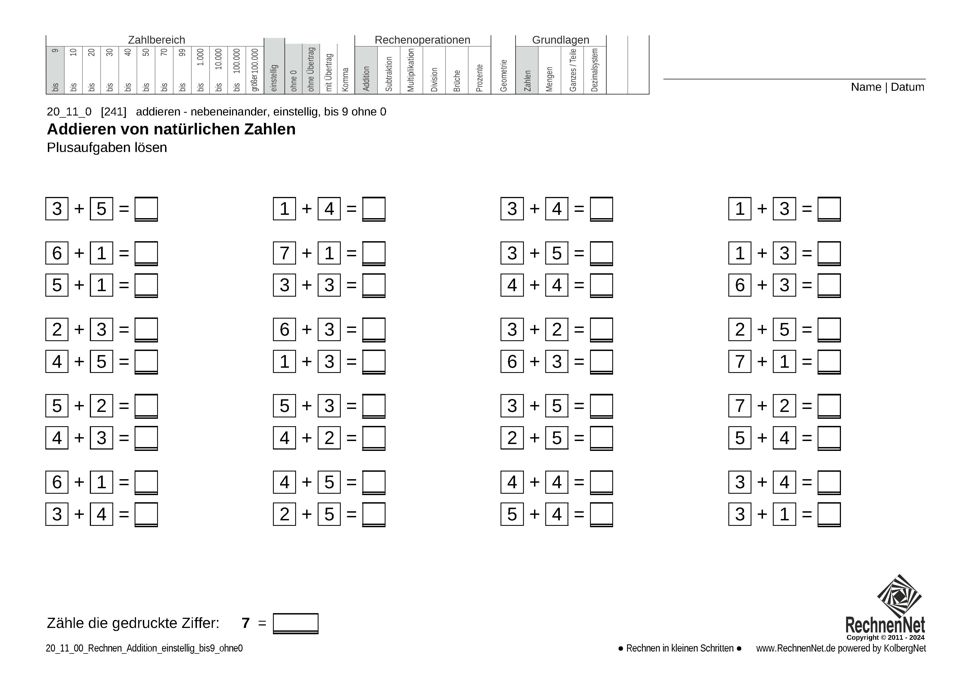 Aufgabenblatt: 20_11_0 Addition einstellig bis9 ohne0173 KB