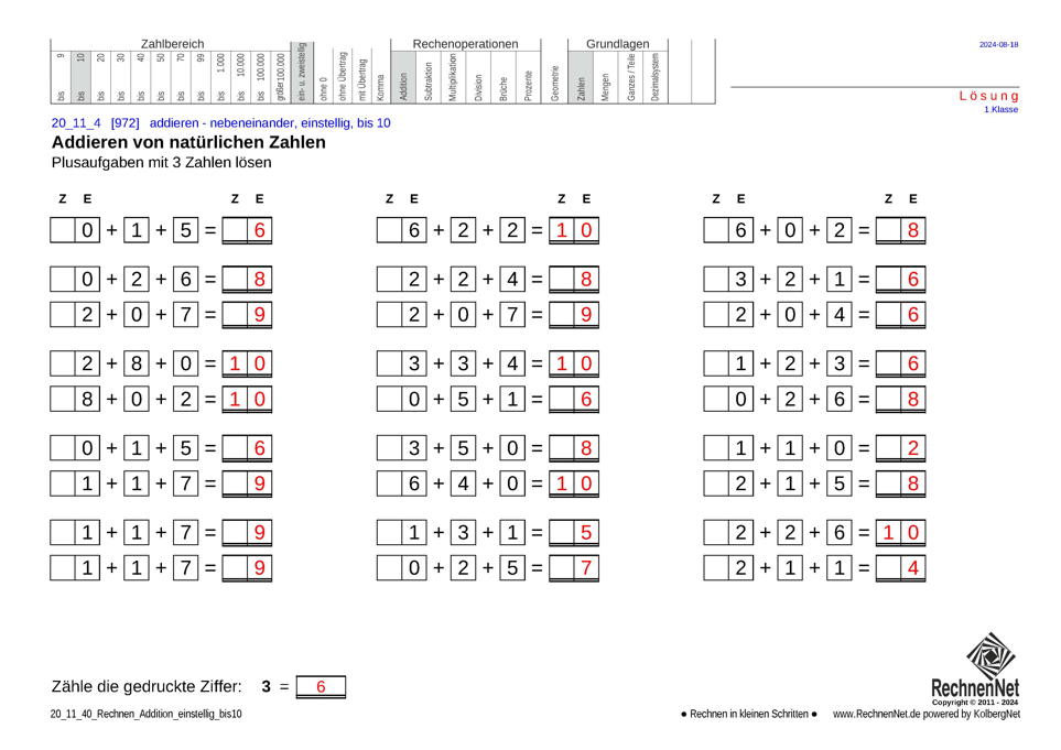 Hier werden zwei oder drei Zahlen bis 9 ohne 0, bis 9 oder bis 10 addiert.
