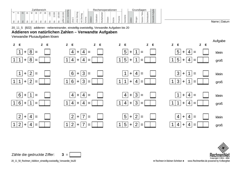 Aufgabenblatt: 20_11_5 Addition einstellig-zweistellig Verwandte bis20179 KB