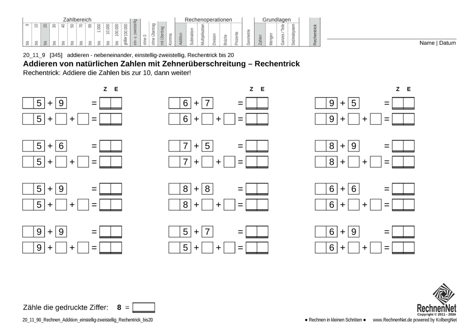 Aufgabenblatt: 20_11_9 Addition einstellig-zweistellig Rechentrick bis20177 KB
