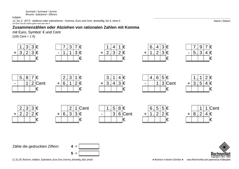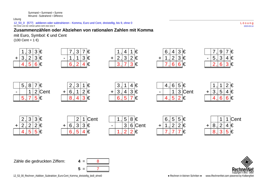 Hier werden bis zu drei Ziffern zusamengezählt oder abgezogen mit Cent oder Euro bis 9