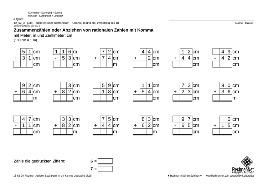 Zusammenzählen oder Abziehen von rationalen zweistelligen Zahlen mit Komma, m und cm