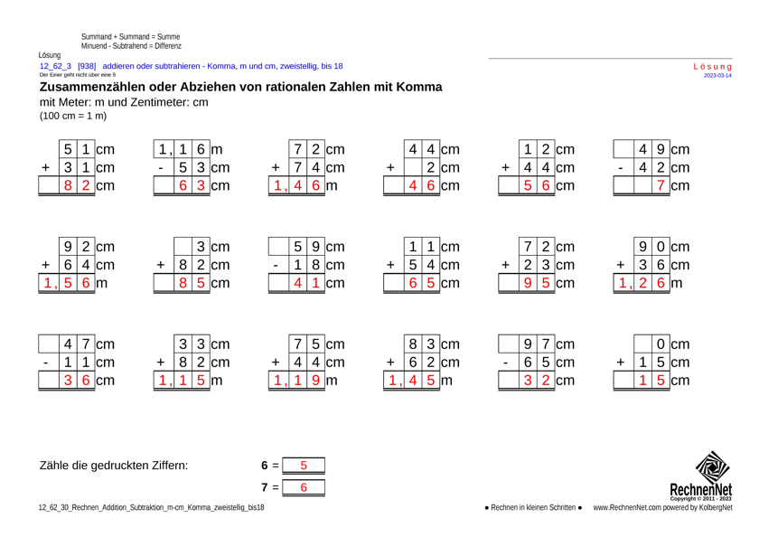 Addition oder Subtraktion von rationalen zweistellig Zahlen mit Komma, m und cm bis 18