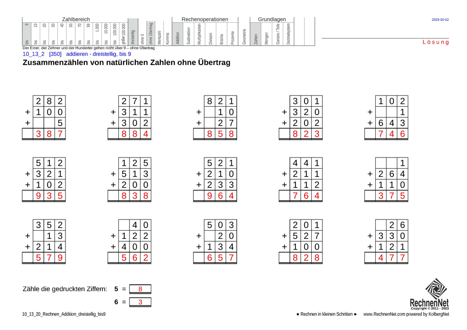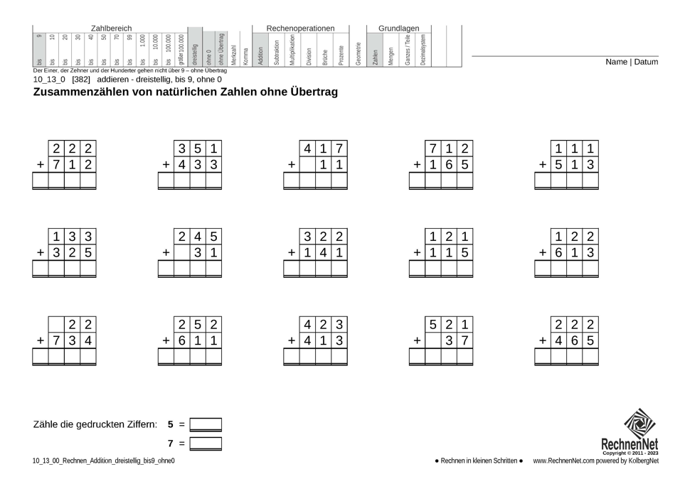 Addition von natürlichen dreistelligen Zahlen bis 9 ohne 0