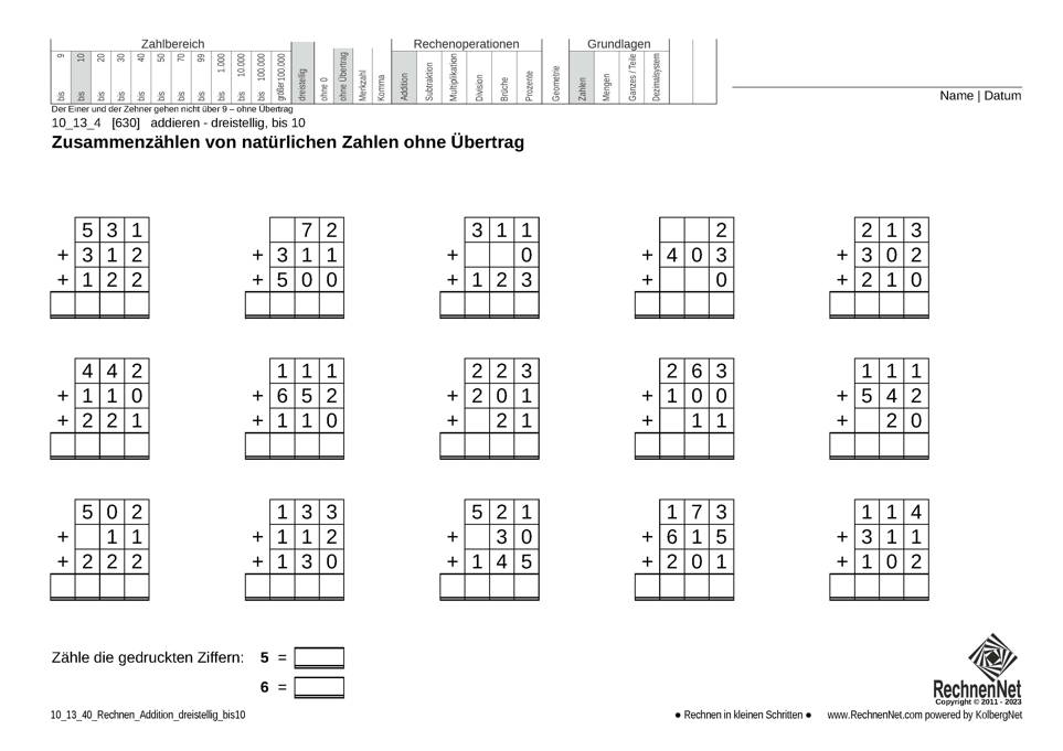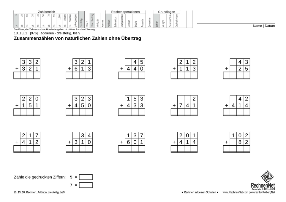 Addition von natürlichen dreistelligen Zahlen bis 10
