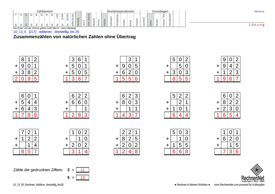 Addition von natürlichen dreistelligen Zahlen bis 20