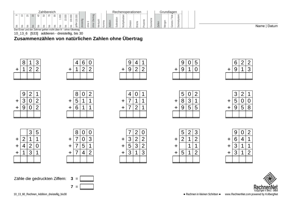 Addition von natürlichen dreistelligen Zahlen bis 30