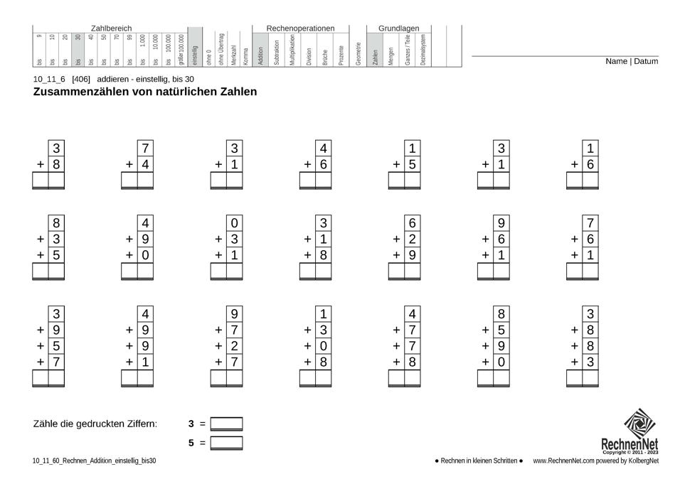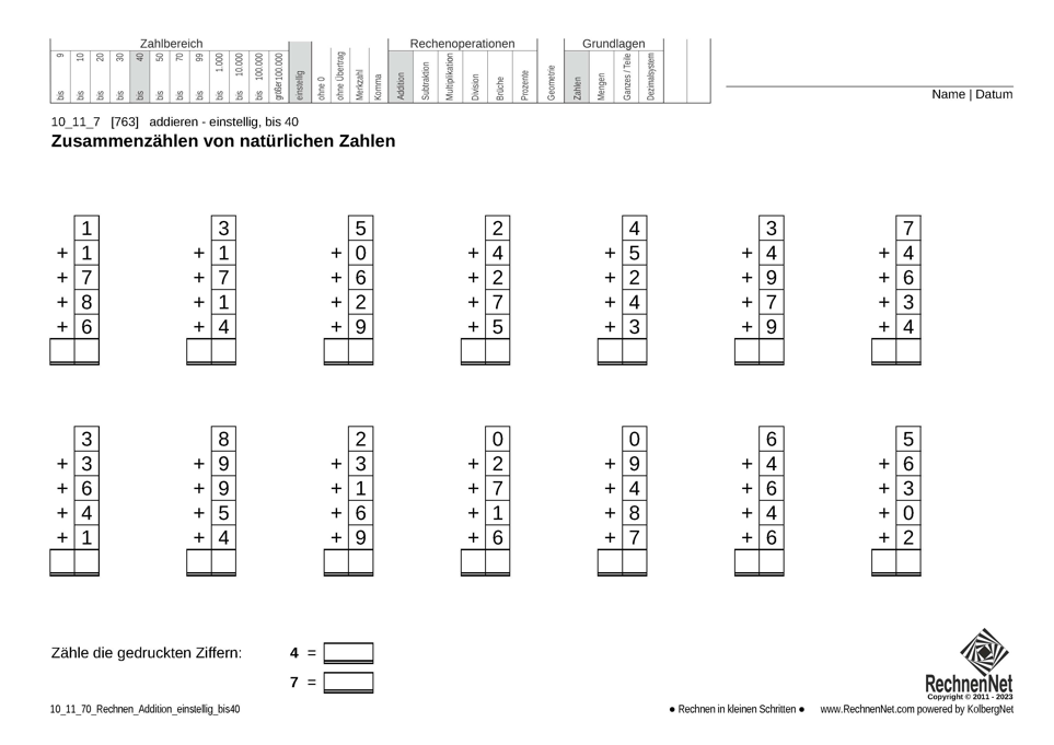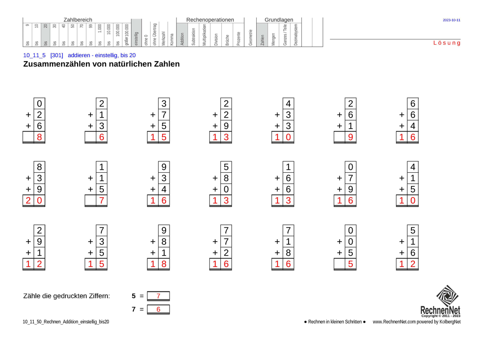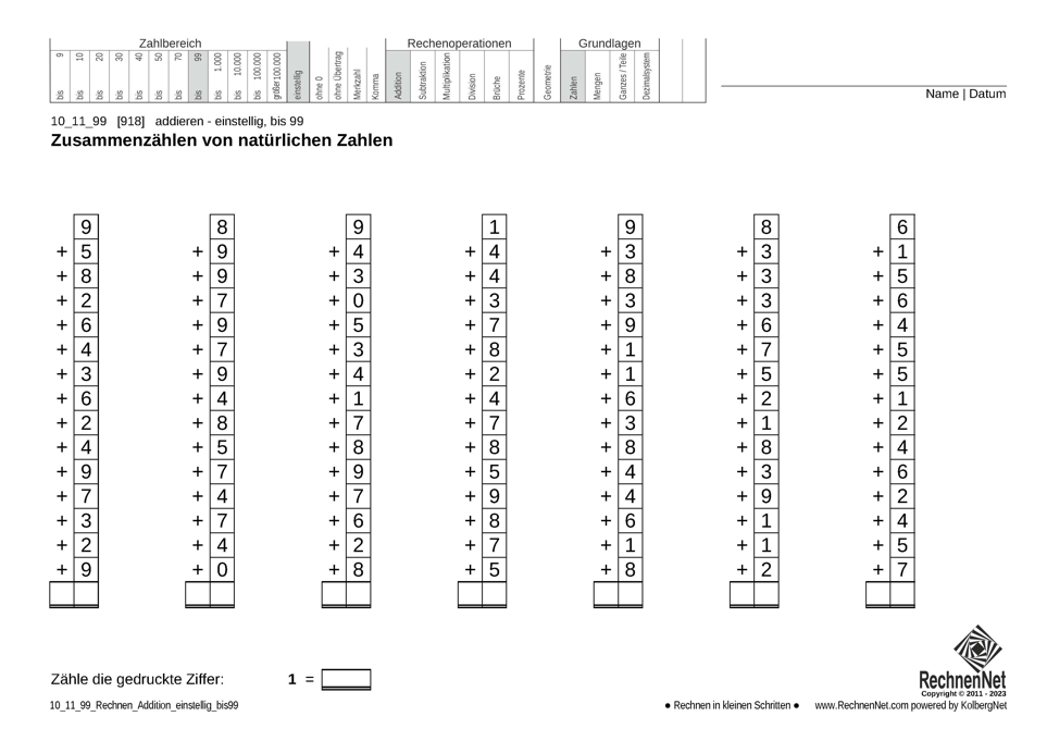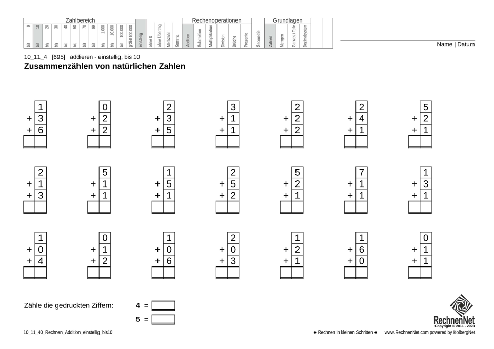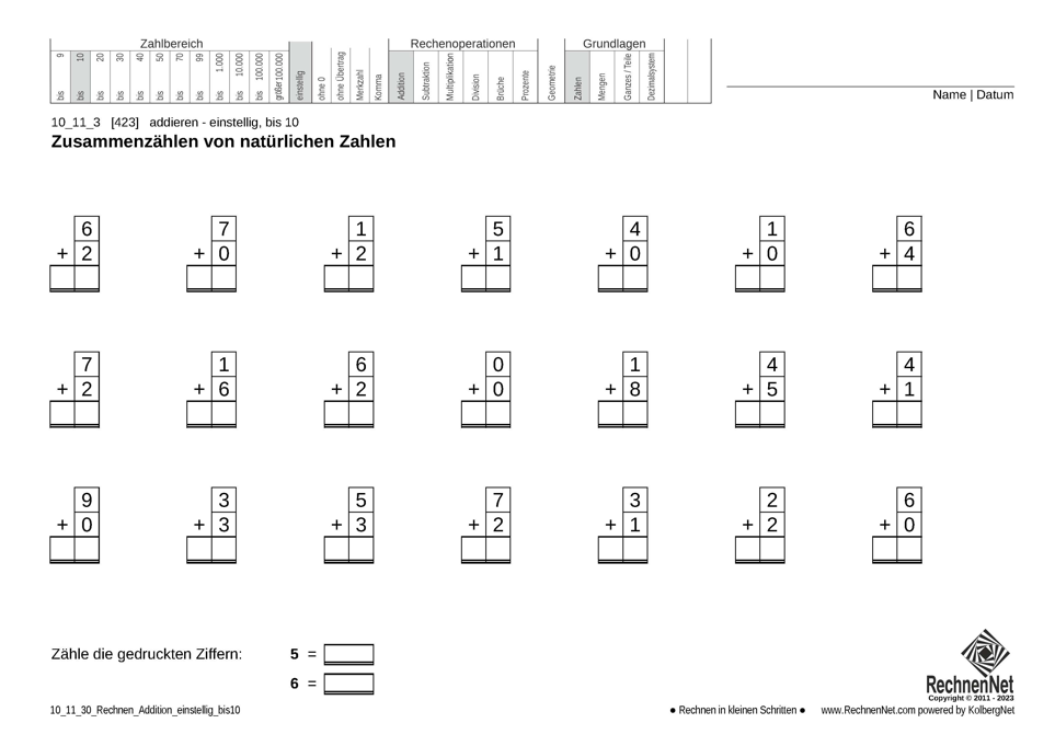 Aufgabenblatt: 10_11_9 Addition einstellig bis 99168 KB