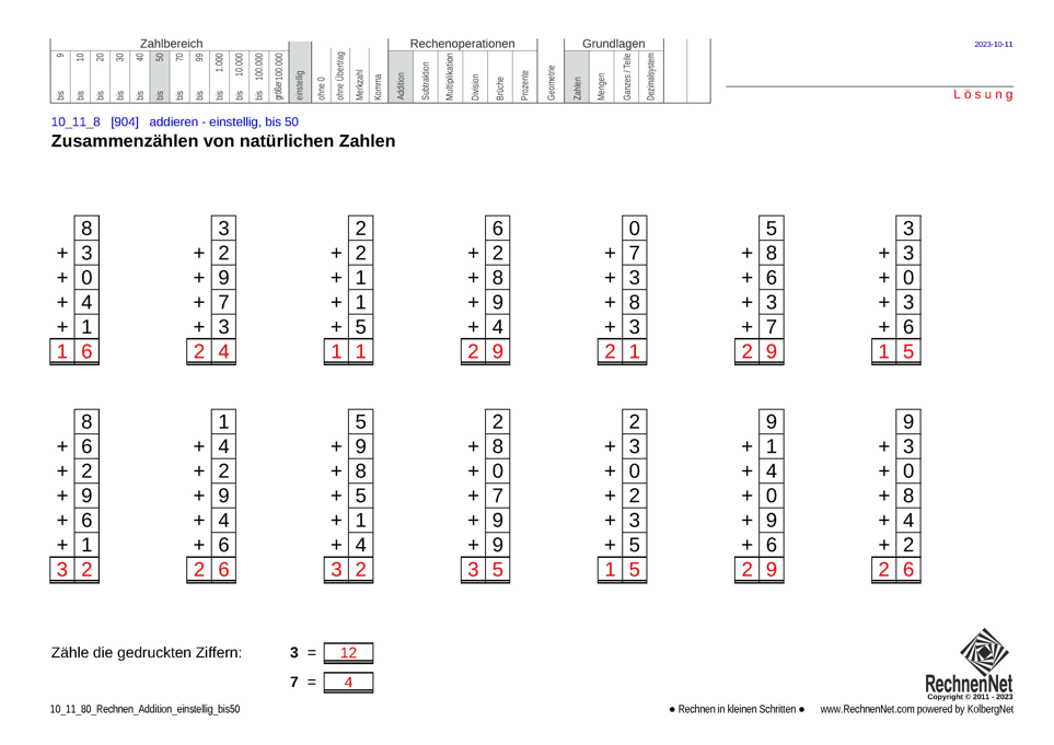 Hier werden bis zu sechs Ziffern zusamengezählt bis 50