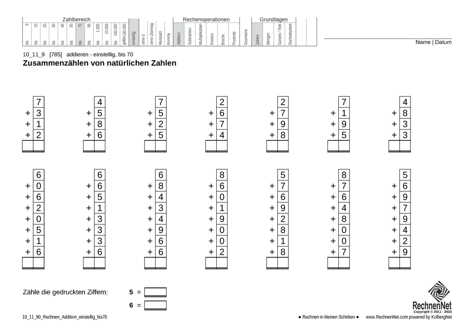 Hier werden bis zu acht Ziffern zusamengezählt bis 70