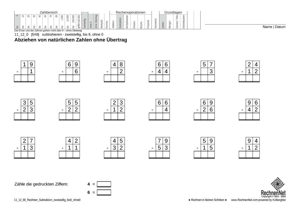 Aufgabenblatt: 11_12_0 Subtraktion zweistellig bis 9 ohne0170 KB