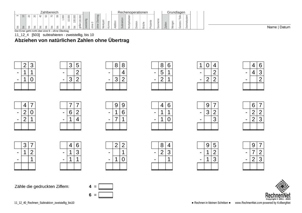 Aufgabenblatt: 11_12_4 Subtraktion zweistellig bis 10171 KB