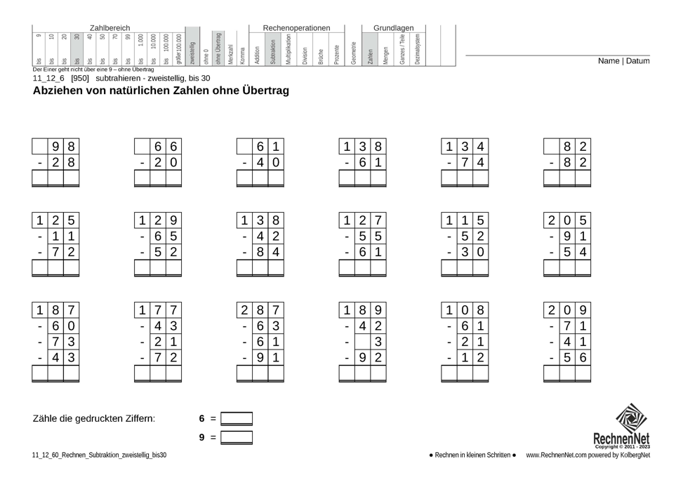 Aufgabenblatt: 11_12_6 Subtraktion zweistellig bis 30171 KB