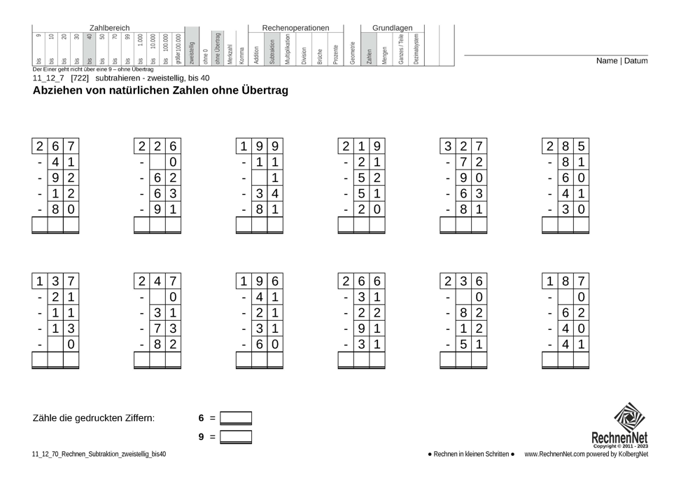 Aufgabenblatt: 11_12_7 Subtraktion zweistellig bis 40170 KB